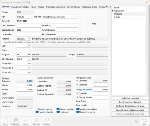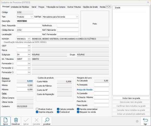 A grade permite criar variações individuais de um mesmo produto (ex.: cor, tamanho, numeração), gerando itens separados para controle de estoque, preço e venda.
