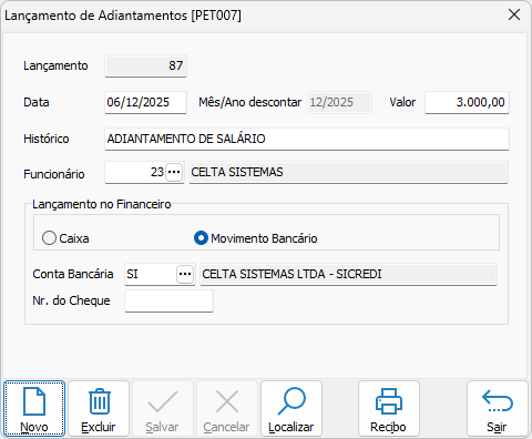 Tela de lançamento de adiantamento
