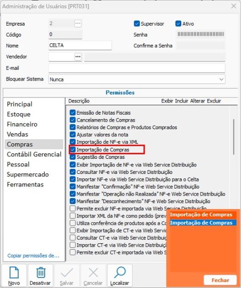 Esta permissão está localizada no módulo Compras dentro da rotina de Administração de Usuários.