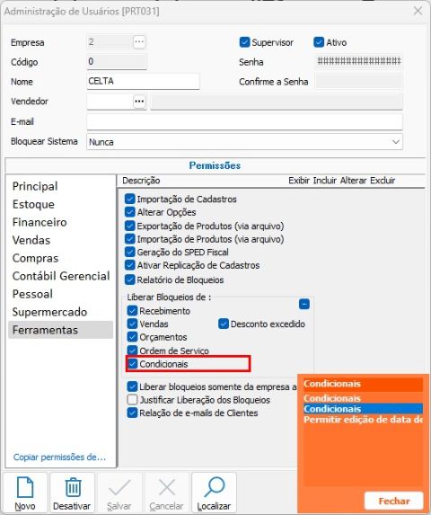 As permissões relacionadas à rotina de Condicionais estão distribuídas entre os grupos Vendas e Ferramentas.