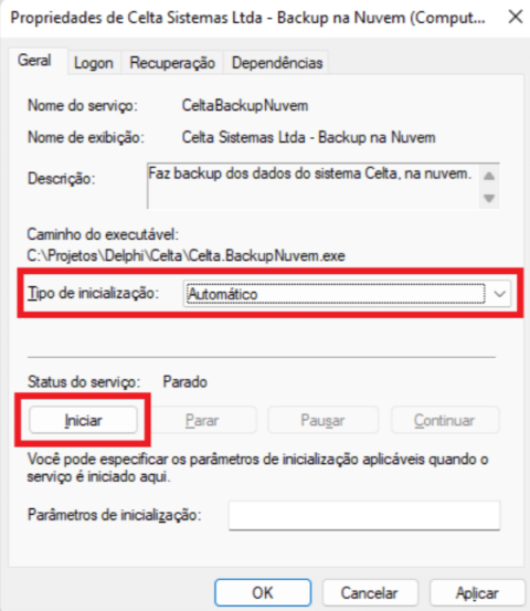 - Dê um duplo clique para abrir as propriedades. Na aba "Geral", altere o Tipo de inicialização para Automático e clique no botão Iniciar.