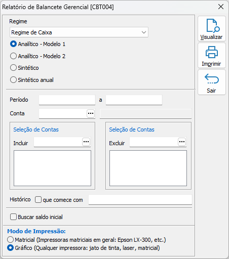 | Buscar saldo inicial | Se marcado, o sistema calcula o saldo acumulado antes da data inicial informada e o apresenta na primeira linha. Fundamental para contas de Saldo (Caixa/Bancos). |