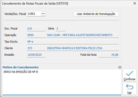 A rotina de Cancelamento de Venda permite cancelar NF-e e NFC-e já emitidas.