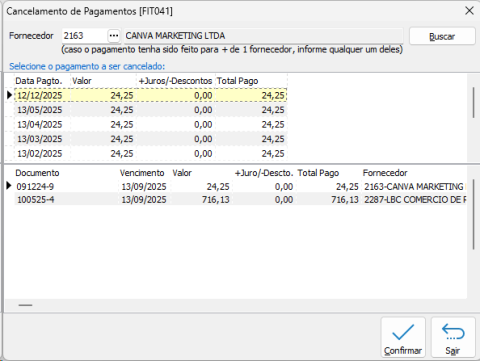 Atenção: Se um pagamento foi realizado agrupando vários títulos (mesmo de fornecedores diferentes), ao confirmar o cancelamento, o sistema estornará TODOS os títulos vinculados àquela operação, sem exceção. Não é possível cancelar parcialmente um pagamento agrupado.