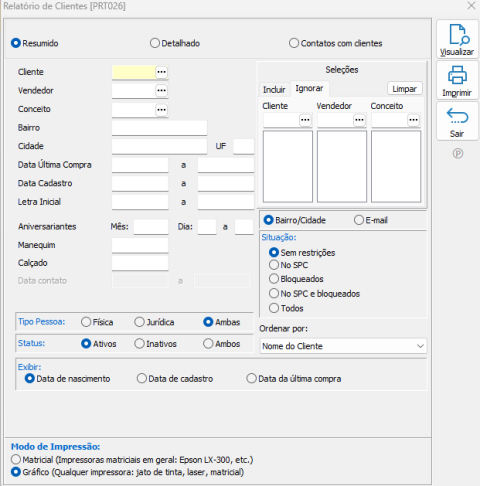 - Resumida: Gera uma listagem ágil contendo apenas dados essenciais: Código, Nome, Bairro, Cidade, Telefone e Data de Nascimento. Ideal para conferência rápida ou listas telefônicas.