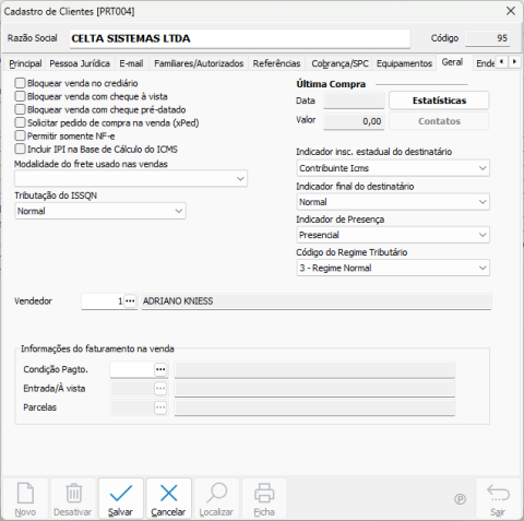 Na aba Geral do cadastro de clientes, os campos do lado direito definem como a nota fiscal será validada pela SEFAZ. Abaixo, a explicação detalhada de cada indicador.