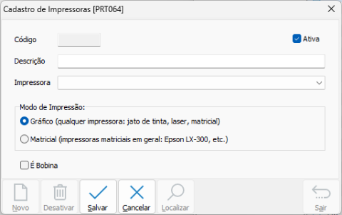 - No menu Outras > Impressoras, clique no botão Novo (barra inferior).
