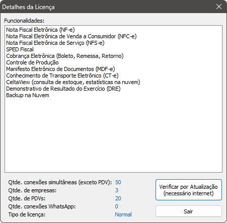 Para clientes em dia, a validação ocorre silenciosamente via internet. O sistema verifica periodicamente no servidor da Celta se a licença está ativa e não requer nenhuma ação do usuário.