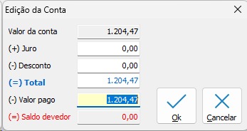 | (-) Valor pago | Valor efetivo que está sendo pago. Se for menor que o total, o sistema gerará um saldo devedor. |