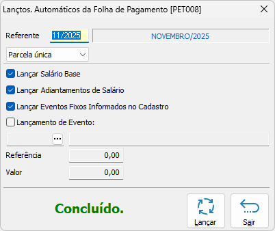 | Lançar Salário Base | Lança o evento de salário conforme o valor base no cadastro do funcionário.