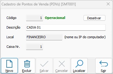 | Caixa Nr. | Número do caixa utilizado nos registros fiscais e fechamento. |