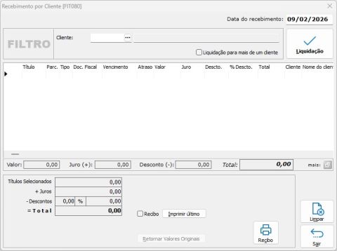 Rotina destinada ao recebimento de títulos em aberto vinculados a um cliente. Permite liquidação total, pagamento parcial e emissão de recibos.