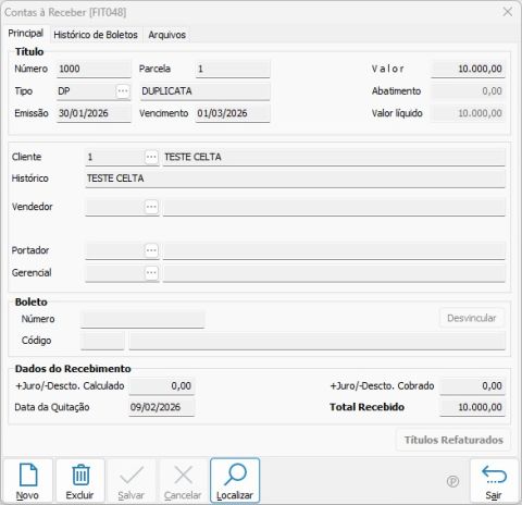 | Data do recebimento | Data considerada para a quitação do título. |