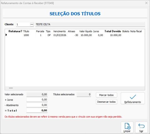 Ao informar o Cliente, o sistema lista automaticamente todos os títulos em aberto que podem ser refaturados.