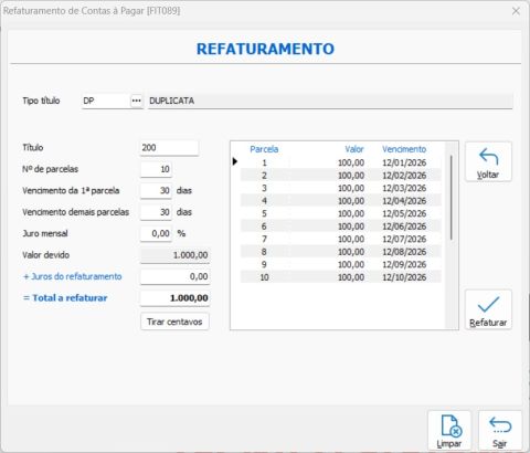 A rotina de Refaturamento de Contas a Pagar é utilizada para reorganizar títulos em aberto, permitindo o parcelamento de valores, a redefinição de vencimentos e a aplicação de juros, quando necessário.