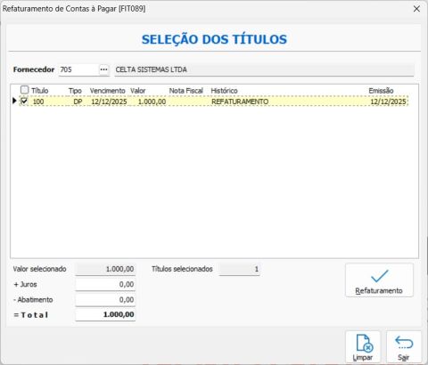 - O sistema exibirá os títulos em aberto vinculados ao fornecedor;