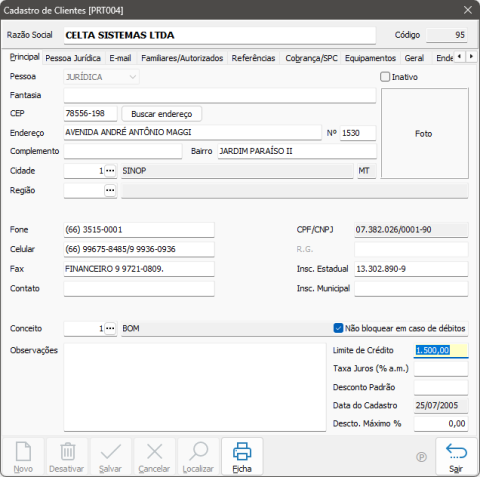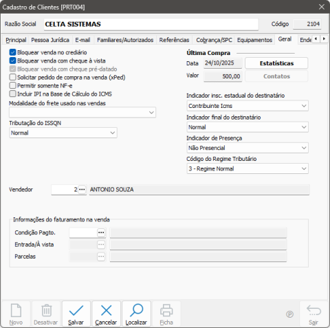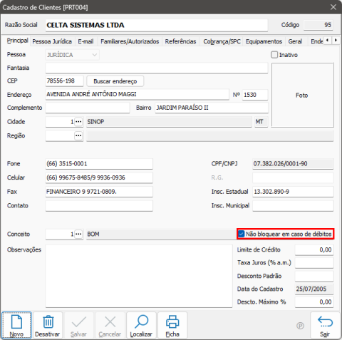 Além das restrições de pagamento, o sistema controla o risco financeiro através do Limite de Crédito e suas permissões especiais. Estas configurações estão localizadas na aba Principal.