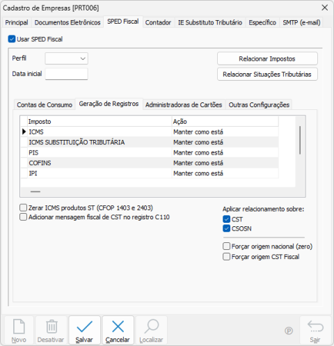 | Usar SPED Fiscal | Marcação obrigatória para habilitar a geração do arquivo para esta empresa. |