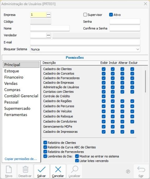 | Supervisor | Quando marcado, permite ao usuário acesso ampliado às rotinas e permissões do sistema. |